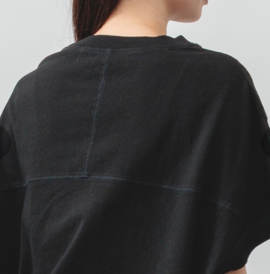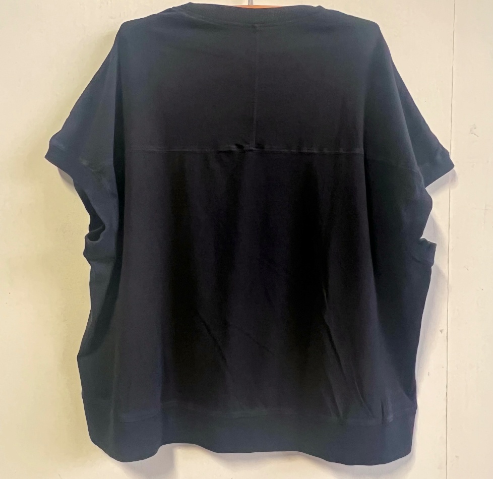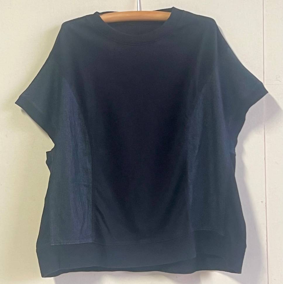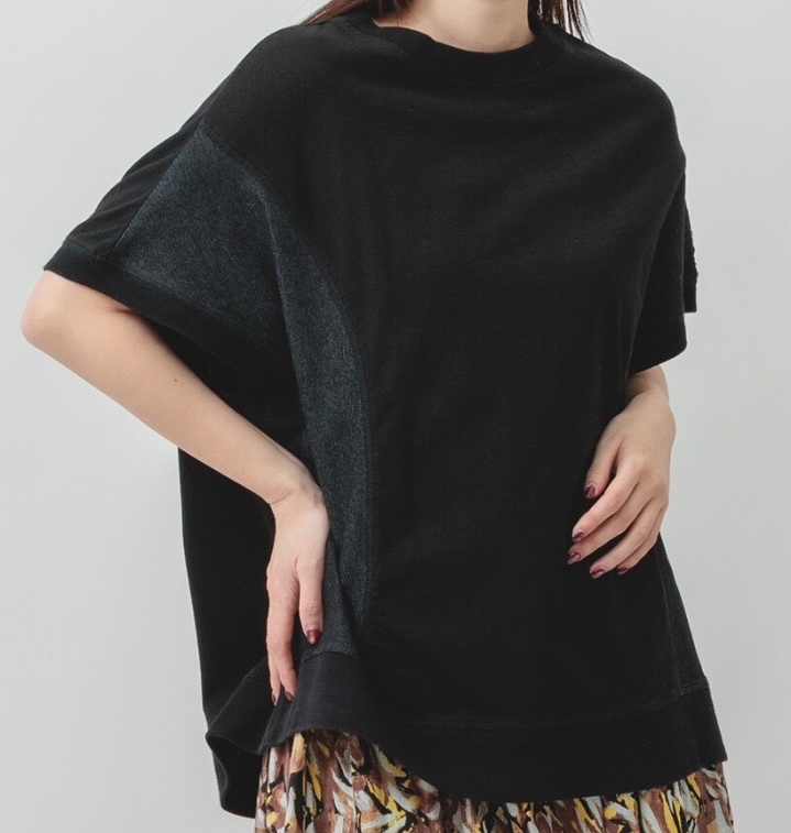 再生繊維(セルロース)4%POLYURETHANE1%フロントの異素材切替デザインでスッキリ見えが叶うプルオーバー。切り替え部分にデニム生地使用。